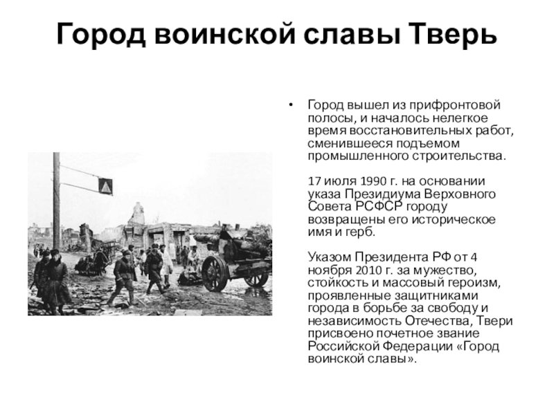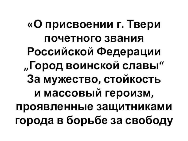 Слайд 5«О присвоении г. Твери почетного звания Российской Федерации „Город воинской славы“