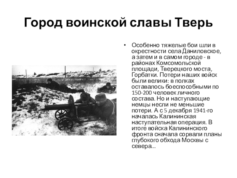 а затем и в самом городе - в районах Комсомольской площади, Тверецкого моста, Горбатки. Потери наших войск были велики: в полках оставалось боеспособными по 150-200 человек личного состава. Но и наступающие немцы несли не меньшие потери. А с 5 декабря 1941-го началась Калининская наступательная операция. В итоге войска Калининского фронта сначала сорвали планы глубокого обхода Москвы с севера...