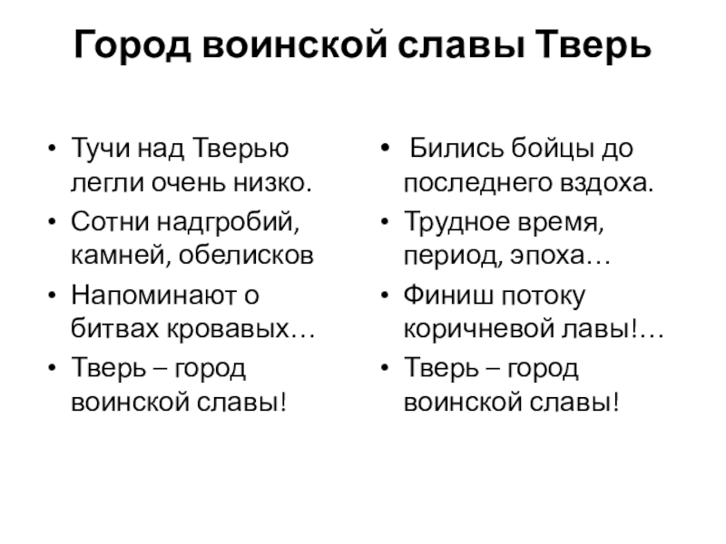предполагаемых вторжений интервентов в центральные русские земли. Могучий и славный город всегда с честью сражался за Отечество. И даже тогда, когда, казалось бы, уже не было сил, жители Твери отдавали последнее. Зачастую – и саму жизнь.