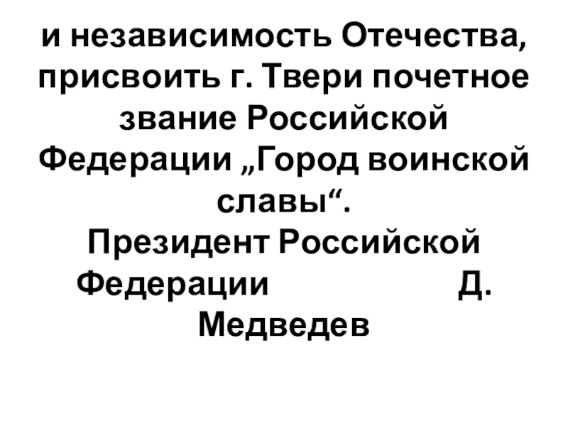 Слайд 6и независимость Отечества, присвоить г. Твери почетное звание Российской Федерации „Город воинской