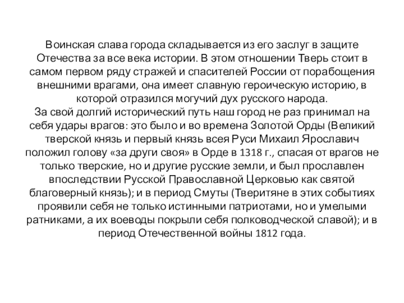 За свой долгий исторический путь наш город не раз принимал на себя удары врагов: это было и во времена Золотой Орды (Великий тверской князь и первый князь всея Руси Михаил Ярославич положил голову «за други своя» в Орде в 1318 г., спасая от врагов не только тверские, но и другие русские земли, и был прославлен впоследствии Русской Православной Церковью как святой благоверный князь); и в период Смуты (Тверитяне в этих событиях проявили себя не только истинными патриотами, но и умелыми ратниками, а их воеводы покрыли себя полководческой славой); и в период Отечественной войны 1812 года.