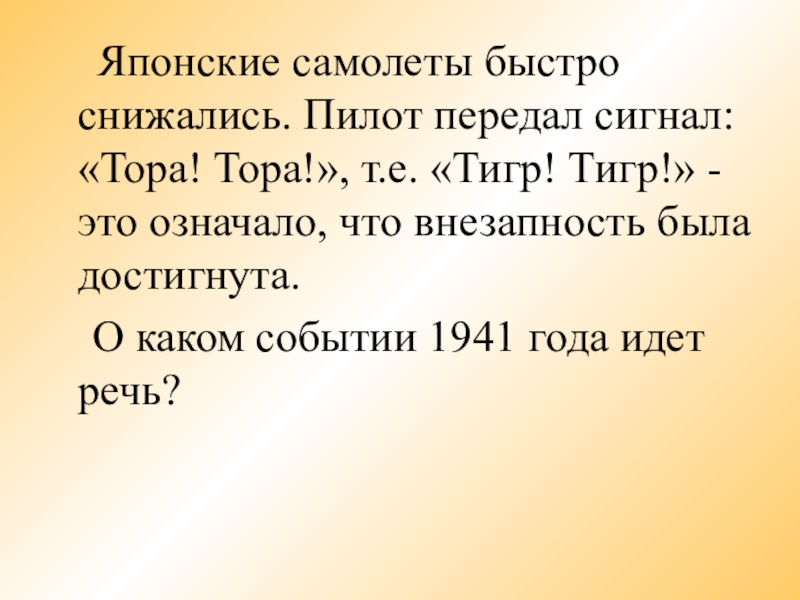 Японские самолеты быстро снижались. Пилот передал сигнал: «Тора!