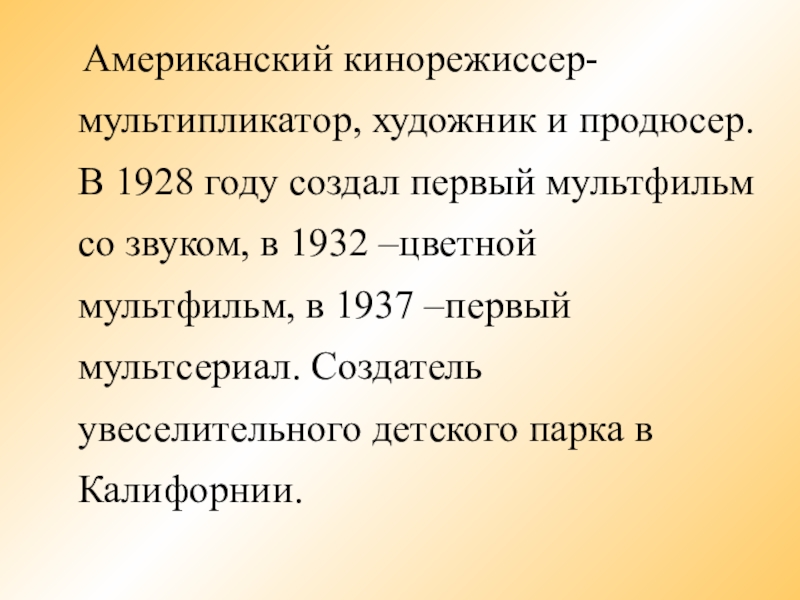 первый мультфильм со звуком, в 1932 –цветной мультфильм, в 1937 –первый мультсериал. Создатель увеселительного детского парка в Калифорнии.