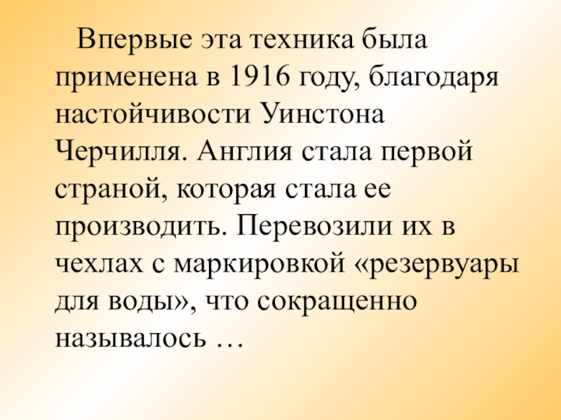 благодаря настойчивости Уинстона Черчилля. Англия стала первой страной, которая стала ее производить. Перевозили их в чехлах с маркировкой «резервуары для воды», что сокращенно называлось …