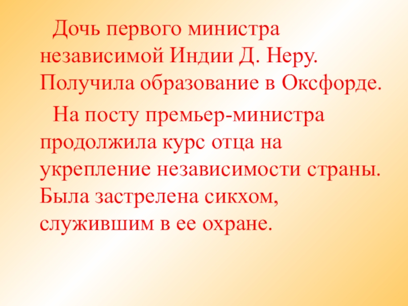 Дочь первого министра независимой Индии Д. Неру.