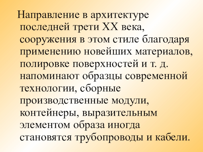 стиле благодаря применению новейших материалов, полировке поверхностей и т. д. напоминают образцы современной технологии, сборные производственные модули, контейнеры, выразительным элементом образа иногда становятся трубопроводы и кабели.