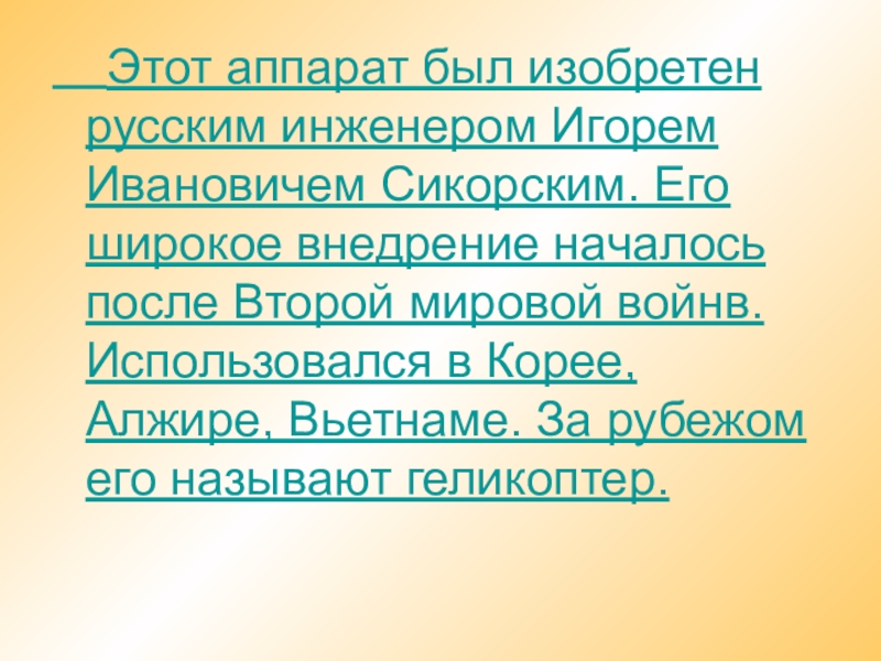 Сикорским. Его широкое внедрение началось после Второй мировой войнв. Использовался в Корее, Алжире, Вьетнаме. За рубежом его называют геликоптер.