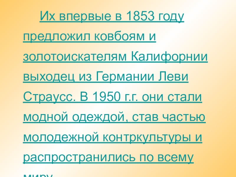 и золотоискателям Калифорнии выходец из Германии Леви Страусс. В 1950 г.г. они стали модной одеждой, став частью молодежной контркультуры и распространились по всему миру.
