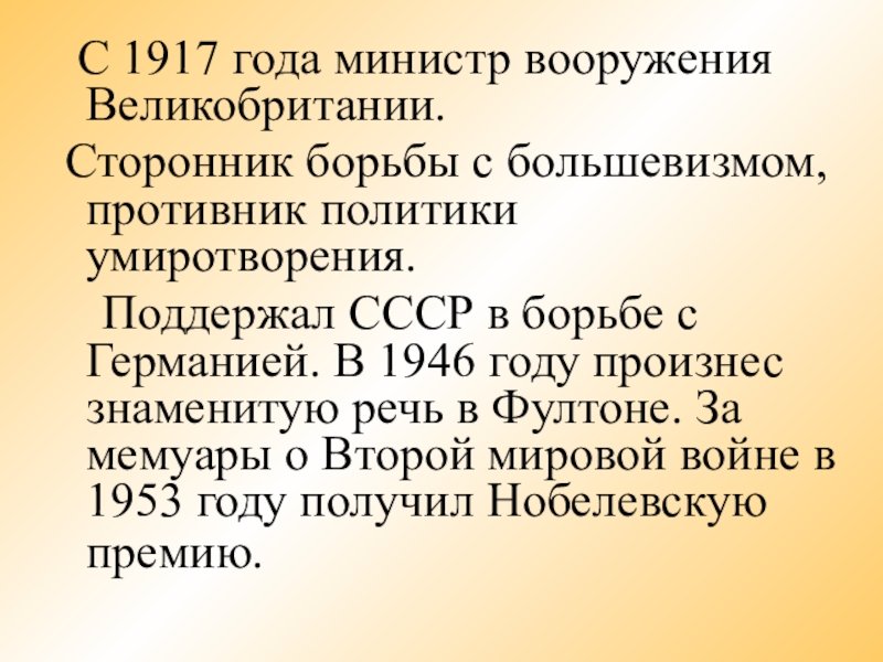 Поддержал СССР в борьбе с Германией. В 1946 году произнес знаменитую речь в Фултоне. За мемуары о Второй мировой войне в 1953 году получил Нобелевскую премию.