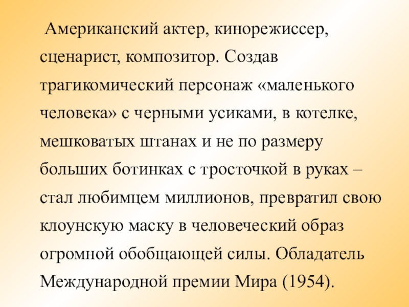 человека» с черными усиками, в котелке, мешковатых штанах и не по размеру больших ботинках с тросточкой в руках – стал любимцем миллионов, превратил свою клоунскую маску в человеческий образ огромной обобщающей силы. Обладатель Международной премии Мира (1954).