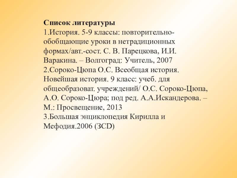2.Сороко-Цюпа О.С. Всеобщая история. Новейшая история. 9 класс: учеб. для общеобразоват. учреждений/ О.С. Сороко-Цюпа, А.О. Сороко-Цюра; под ред. А.А.Искандерова. – М.: Просвещение, 2013