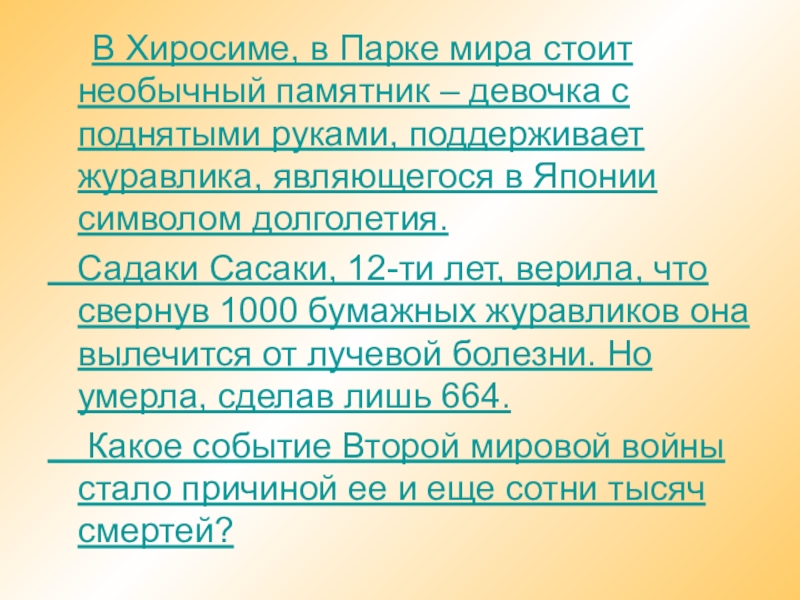 Садаки Сасаки, 12-ти лет, верила, что свернув 1000 бумажных журавликов она вылечится от лучевой болезни. Но умерла, сделав лишь 664.