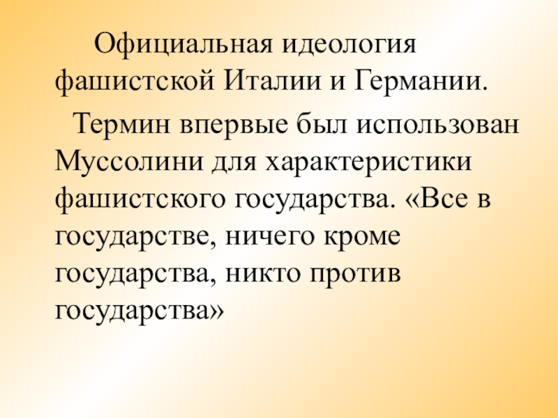 Термин впервые был использован Муссолини для характеристики фашистского государства. «Все в государстве, ничего кроме государства, никто против государства»