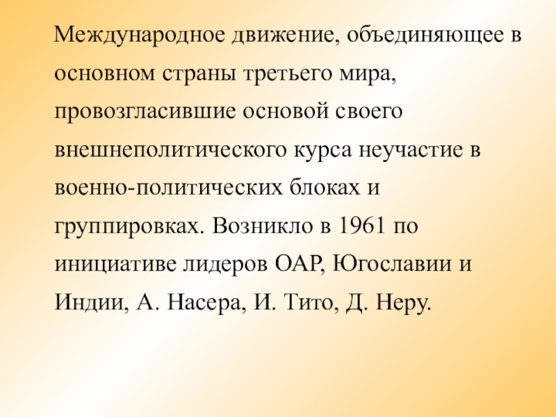 мира, провозгласившие основой своего внешнеполитического курса неучастие в военно-политических блоках и группировках. Возникло в 1961 по инициативе лидеров ОАР, Югославии и Индии, А. Насера, И. Тито, Д. Неру.