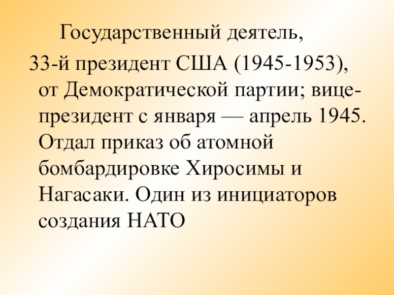 Демократической партии; вице-президент с января — апрель 1945. Отдал приказ об атомной бомбардировке Хиросимы и Нагасаки. Один из инициаторов создания НАТО
