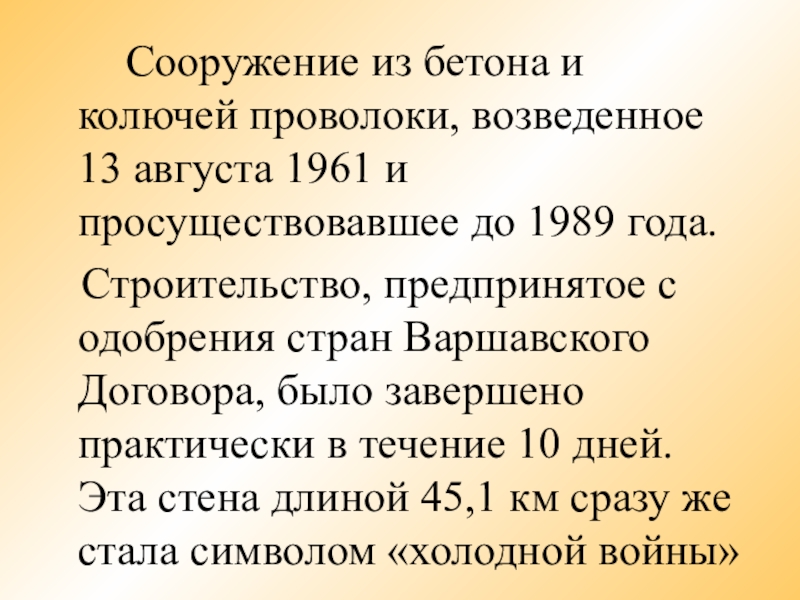 Строительство, предпринятое с одобрения стран Варшавского Договора, было завершено практически в течение 10 дней. Эта стена длиной 45,1 км сразу же стала символом «холодной войны»