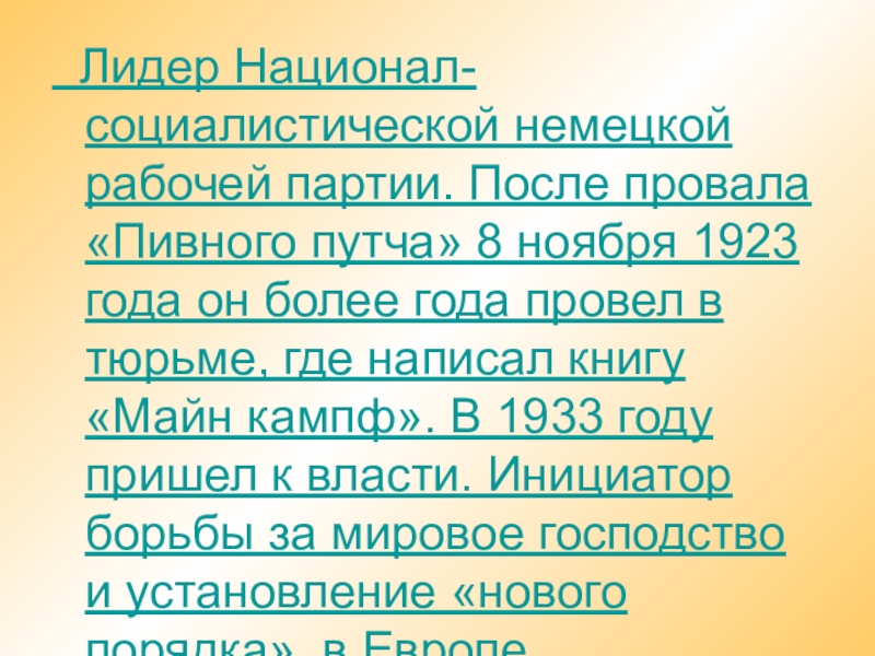 ноября 1923 года он более года провел в тюрьме, где написал книгу «Майн кампф». В 1933 году пришел к власти. Инициатор борьбы за мировое господство и установление «нового порядка» в Европе.