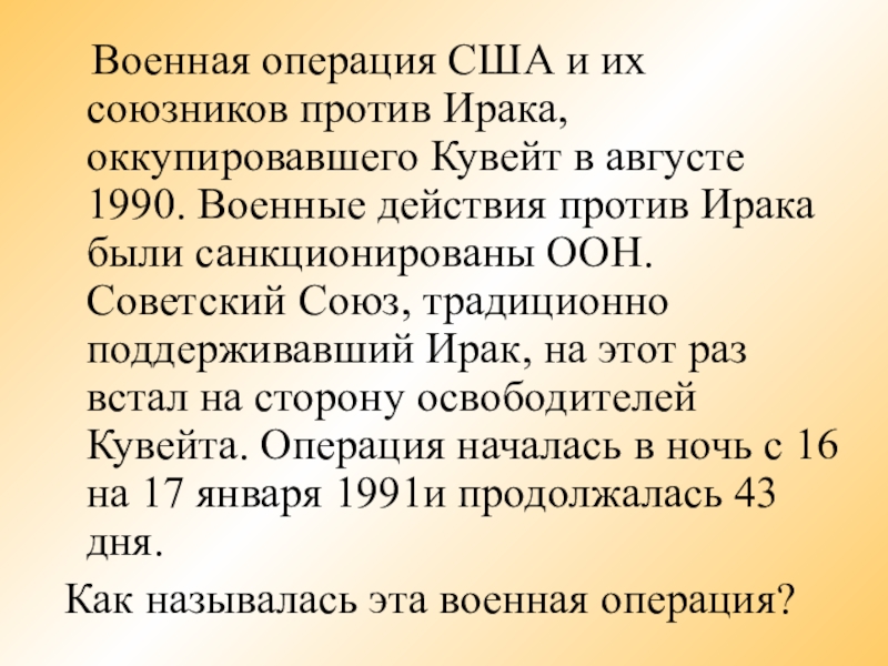 Кувейт в августе 1990. Военные действия против Ирака были санкционированы ООН. Советский Союз, традиционно поддерживавший Ирак, на этот раз встал на сторону освободителей Кувейта. Операция началась в ночь с 16 на 17 января 1991и продолжалась 43 дня.