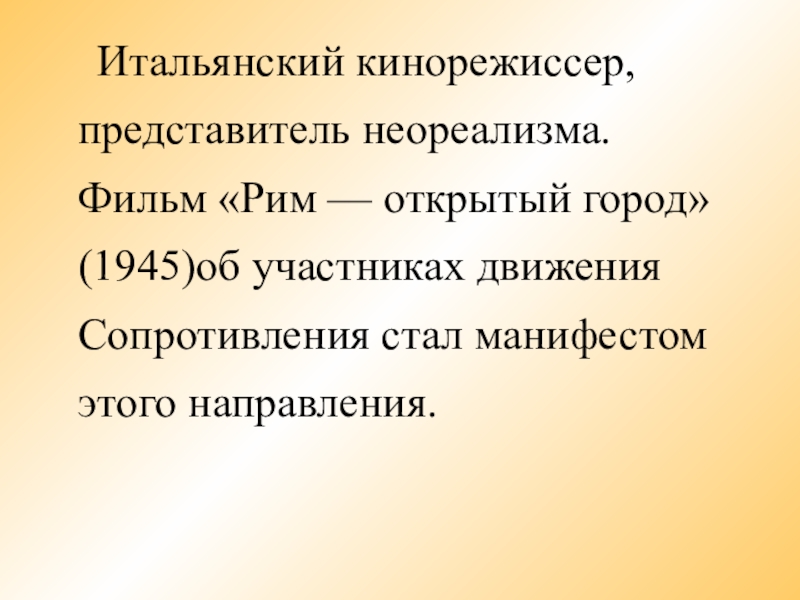 Итальянский кинорежиссер, представитель неореализма. Фильм «Рим — открытый