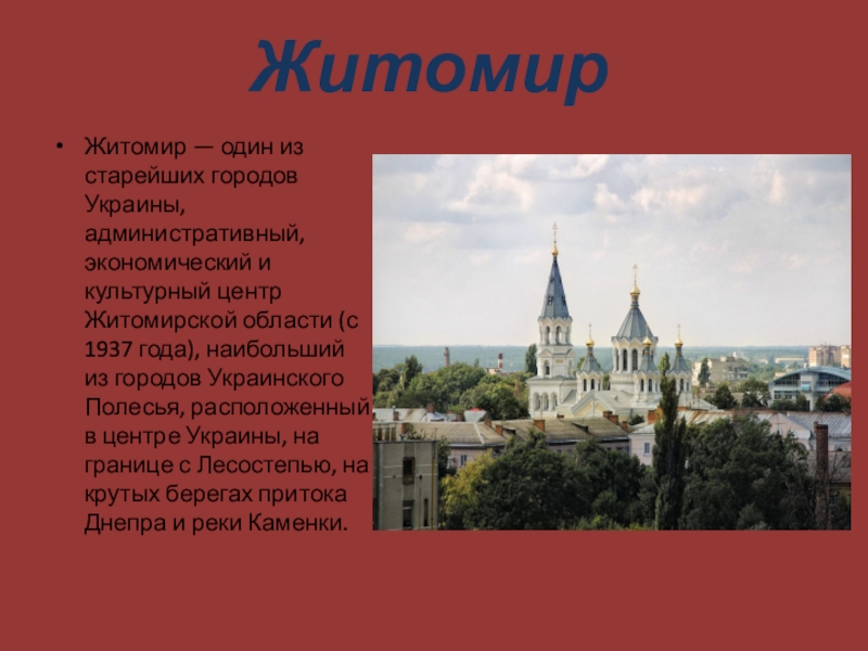 центр Житомирской области (с 1937 года), наибольший из городов Украинского Полесья, расположенный в центре Украины, на границе с Лесостепью, на крутых берегах притока Днепра и реки Каменки.