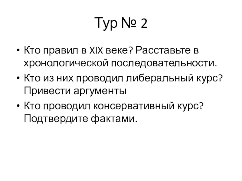 Тур № 2Кто правил в XIX веке? Расставьте в хронологической последовательности.Кто из них проводил либеральный курс? Привести