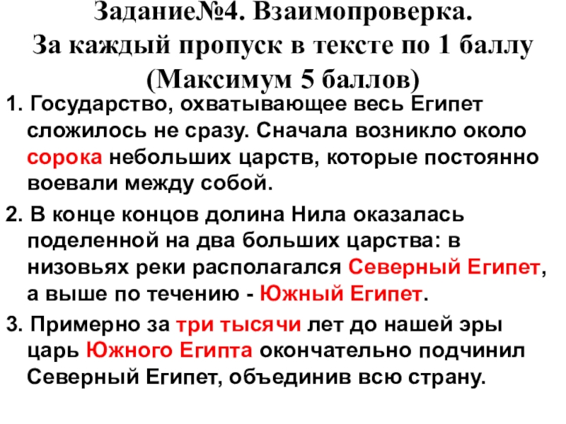 1. Государство, охватывающее весь Египет сложилось не сразу. Сначала возникло около сорока небольших царств, которые постоянно воевали между собой.