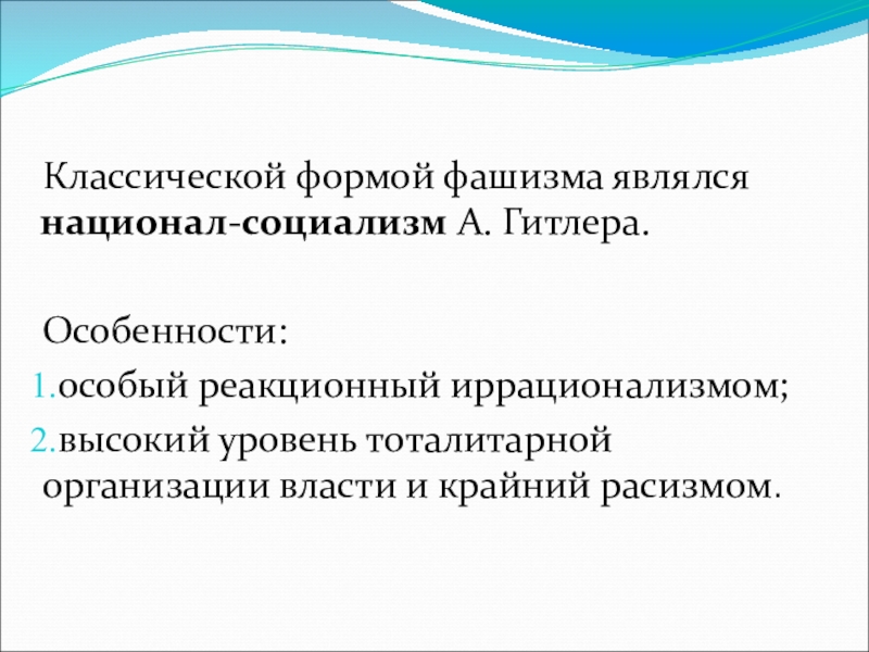 Классической формой фашизма являлся национал-социализм А. Гитлера.