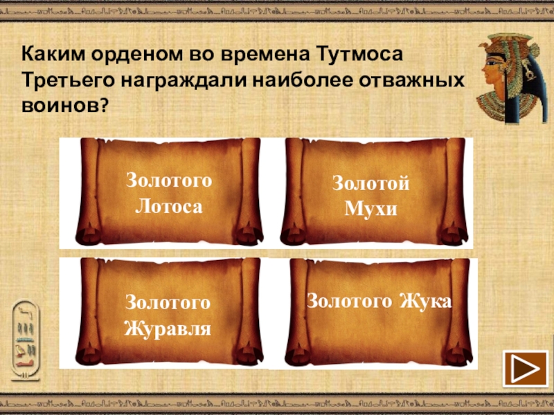 Слайд 15Каким орденом во времена Тутмоса Третьего награждали наиболее отважных воинов?