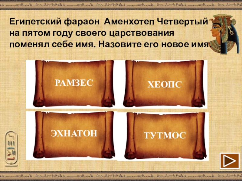 Слайд 13Египетский фараон Аменхотеп Четвертый на пятом году своего царствования поменял себе