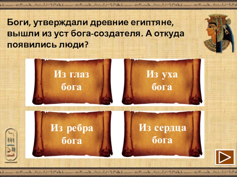 Слайд 7Боги, утверждали древние египтяне, вышли из уст бога-создателя. А откуда появились