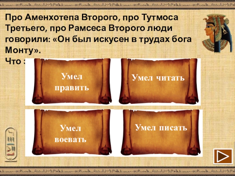 Слайд 16Про Аменхотепа Второго, про Тутмоса Третьего, про Рамсеса Второго люди говорили: