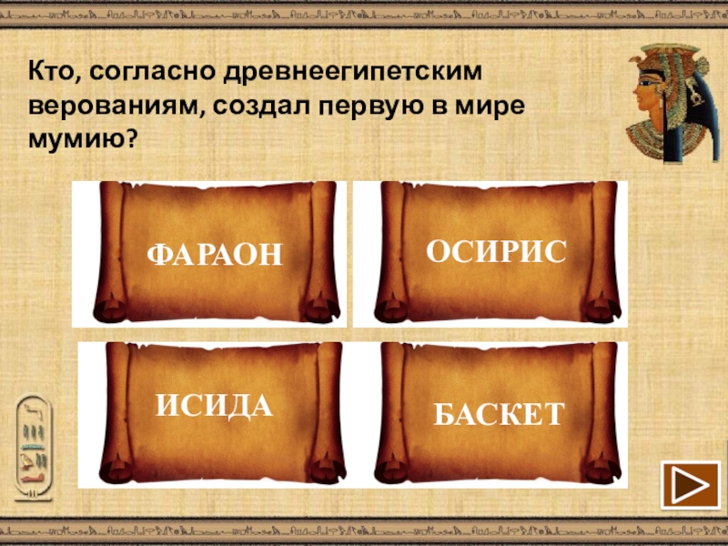 Слайд 9Кто, согласно древнеегипетским верованиям, создал первую в мире мумию?
