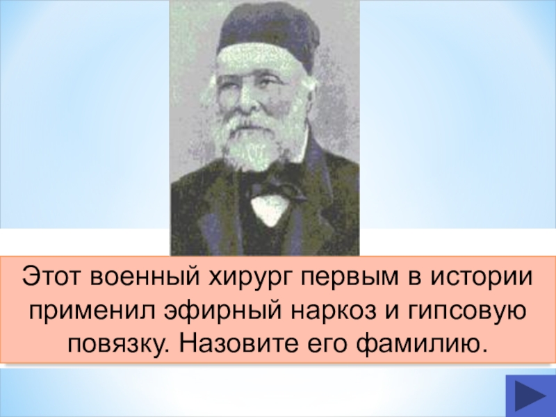Этот военный хирург первым в истории применил эфирный наркоз и гипсовую повязку. Назовите его фамилию.