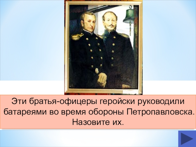 Слайд 29Эти братья-офицеры геройски руководили батареями во время обороны Петропавловска. Назовите их.