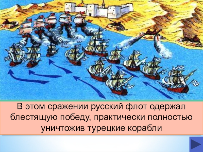 Слайд 3В этом сражении русский флот одержал блестящую победу, практически полностью уничтожив