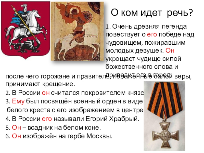 1. Очень древняя легенда повествует о его победе над чудовищем, пожиравшим