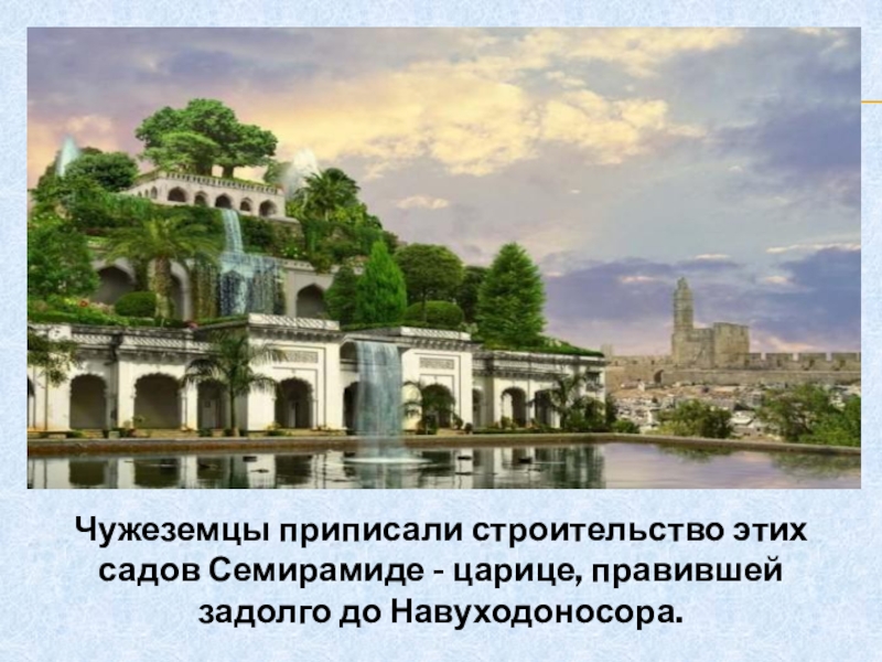 Слайд 7Чужеземцы приписали строительство этих садов Семирамиде - царице, правившей задолго до