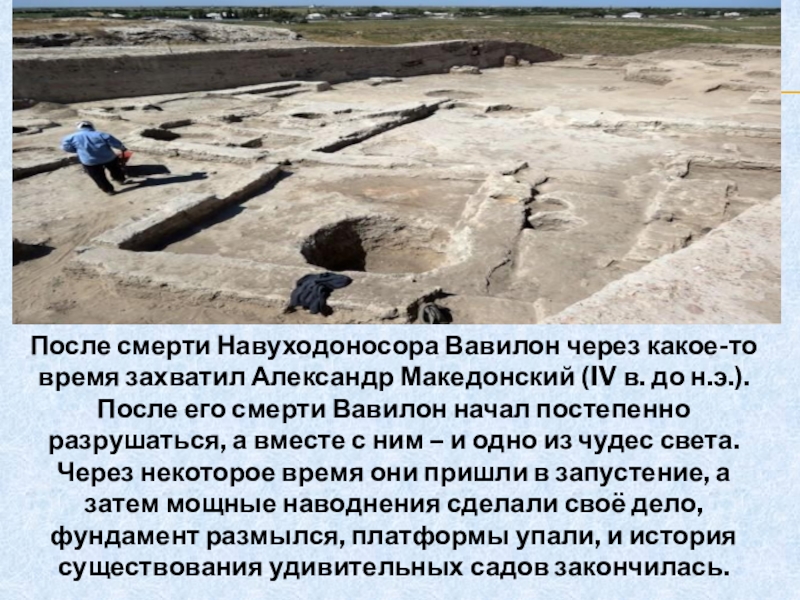 в. до н.э.). После его смерти Вавилон начал постепенно разрушаться, а вместе с ним – и одно из чудес света. Через некоторое время они пришли в запустение, а затем мощные наводнения сделали своё дело, фундамент размылся, платформы упали, и история существования удивительных садов закончилась.