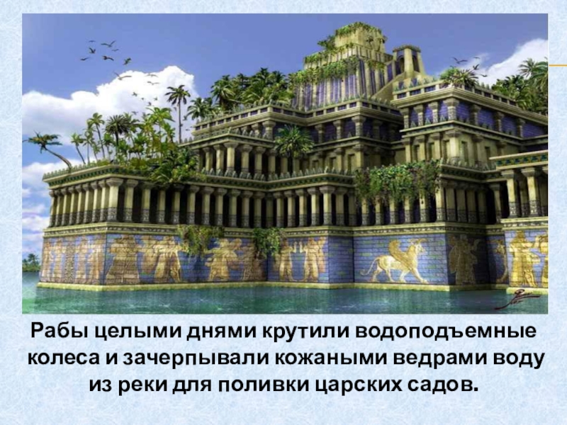 Слайд 6Рабы целыми днями крутили водоподъемные колеса и зачерпывали кожаными ведрами воду