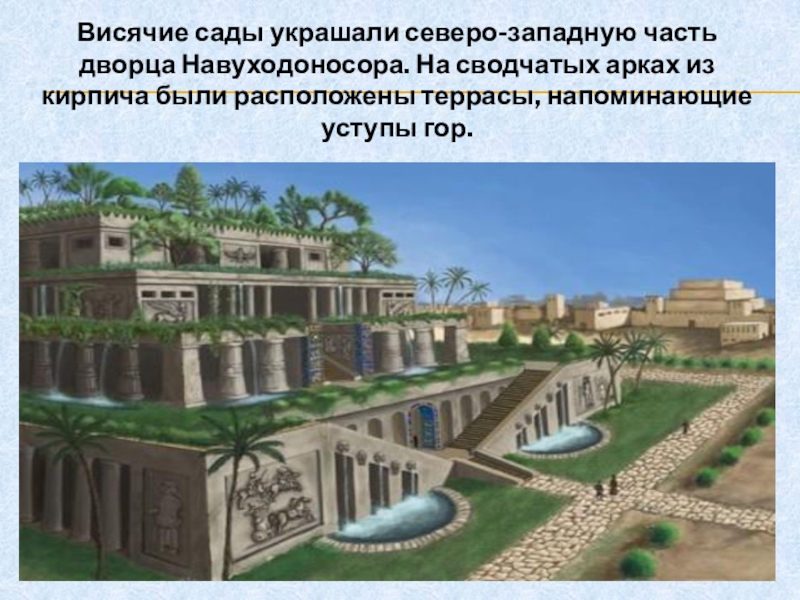 Слайд 4Висячие сады украшали северо-западную часть дворца Навуходоносора. На сводчатых арках из