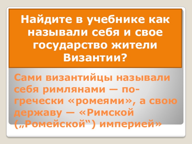 Найдите в учебнике как называли себя и свое государство жители Византии?