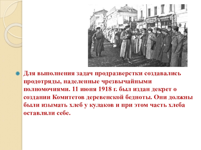 Слайд 8Для выполнения задач продразверстки создавались продотряды, наделенные чрезвычайными полномочиями. 11 июня