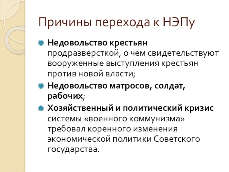 Слайд 16Причины перехода к НЭПу