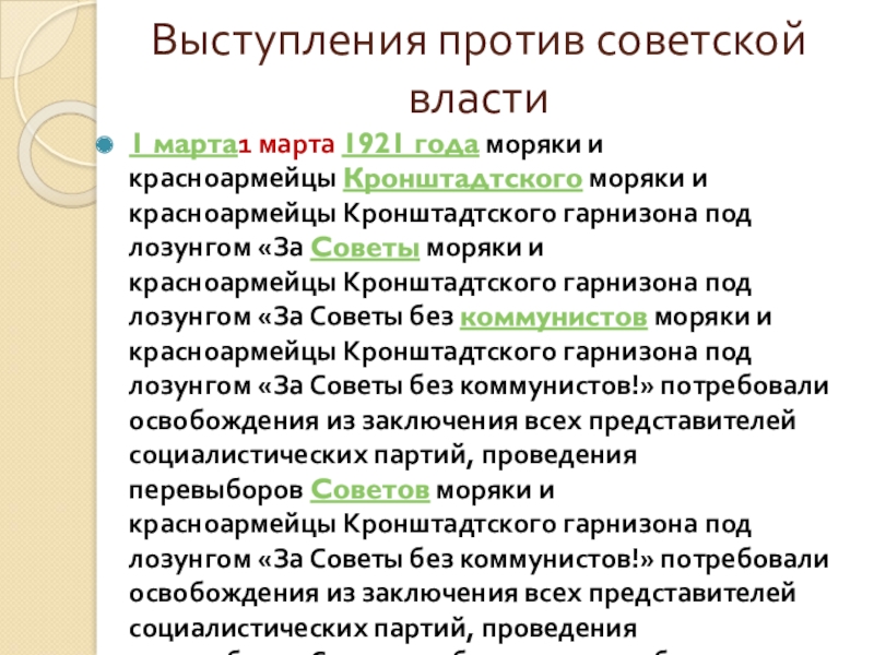лозунгом «За Советы моряки и красноармейцы Кронштадтского гарнизона под лозунгом «За Советы без коммунистов моряки и красноармейцы Кронштадтского гарнизона под лозунгом «За Советы без коммунистов!» потребовали освобождения из заключения всех представителей социалистических партий, проведения перевыборов Советов моряки и красноармейцы Кронштадтского гарнизона под лозунгом «За Советы без коммунистов!» потребовали освобождения из заключения всех представителей социалистических партий, проведения перевыборов Советов , обеспечения свободы торговли, разрешения крестьянам свободно пользоваться своей землёй и распоряжаться продуктами моряки и красноармейцы Кронштадтского гарнизона под лозунгом «За Советы без коммунистов!» потребовали освобождения из заключения всех представителей социалистических партий, проведения перевыборов Советов , обеспечения свободы торговли, разрешения крестьянам свободно пользоваться своей землёй и распоряжаться продуктами своего хозяйства, то есть ликвидации продразвёрстки моряки и красноармейцы Кронштадтского гарнизона под лозунгом «За Советы без коммунистов!» потребовали освобождения из заключения всех представителей социалистических партий, проведения перевыборов Советов , обеспечения свободы торговли, разрешения крестьянам свободно пользоваться своей землёй и распоряжаться продуктами своего хозяйства, то есть ликвидации продразвёрстки. Убедившись в невозможности договориться с восставшими, власти предприняли штурм моряки и красноармейцы Кронштадтского гарнизона под лозунгом «За Советы без коммунистов!» потребовали освобождения из заключения всех представителей социалистических партий, проведения перевыборов Советов , обеспечения свободы торговли, разрешения крестьянам свободно пользоваться своей землёй и распоряжаться продуктами своего хозяйства, то есть ликвидации продразвёрстки. Убедившись в невозможности договориться с восставшими, власти предприняли штурм Кронштадта моряки и красноармейцы Кронштадтского гарнизона под лозунгом «За Советы без коммунистов!» потребовали освобождения из заключения всех представителей социалистических партий, проведения перевыборов Советов , обеспечения свободы торговли, разрешения крестьянам свободно пользоваться своей землёй и распоряжаться продуктами своего хозяйства, то есть ликвидации продразвёрстки. Убедившись в невозможности договориться с восставшими, власти предприняли штурм Кронштадта. Чередуя артиллерийский обстрел и действия пехоты, к 18 марта моряки и красноармейцы Кронштадтского гарнизона под лозунгом «За Советы без коммунистов!» потребовали освобождения из заключения всех представителей социалистических партий, проведения перевыборов Советов , обеспечения свободы торговли, разрешения крестьянам свободно пользоваться своей землёй и распоряжаться продуктами своего хозяйства, то есть ликвидации продразвёрстки. Убедившись в невозможности договориться с восставшими, власти предприняли штурм Кронштадта. Чередуя артиллерийский обстрел и действия пехоты, к 18 марта Кронштадт моряки и красноармейцы Кронштадтского гарнизона под лозунгом «За Советы без коммунистов!» потребовали освобождения из заключения всех представителей социалистических партий, проведения перевыборов Советов , обеспе