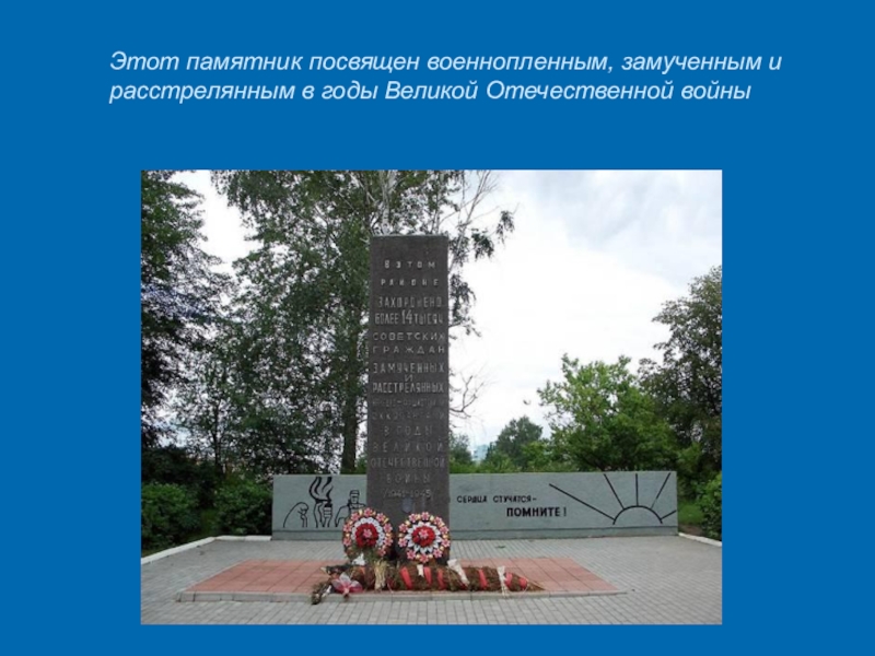 Слайд 9Этот памятник посвящен военнопленным, замученным и расстрелянным в годы Великой Отечественной