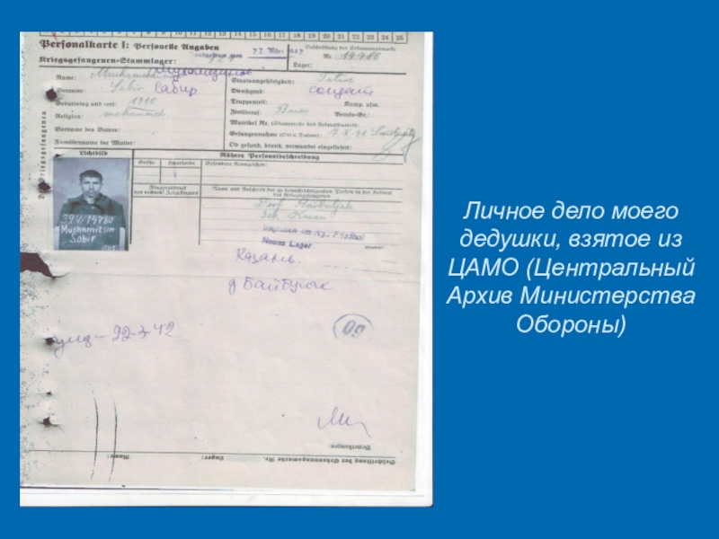 Слайд 2Личное дело моего дедушки, взятое из ЦАМО (Центральный Архив Министерства Обороны)