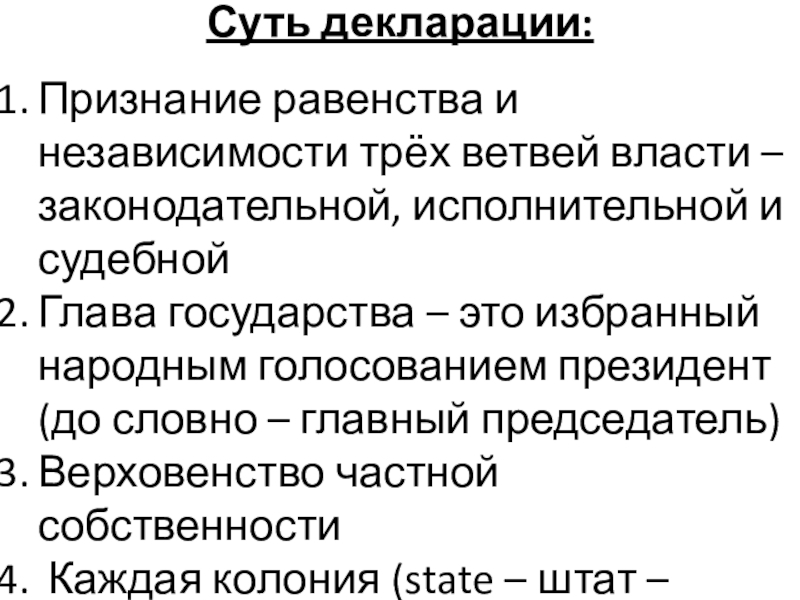 Суть декларации:Признание равенства и независимости трёх ветвей власти – законодательной, исполнительной и судебнойГлава государства – это избранный