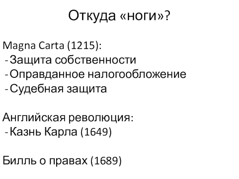 Откуда «ноги»?Magna Carta (1215):Защита собственностиОправданное налогообложениеСудебная защитаАнглийская революция:Казнь Карла (1649)Билль о правах (1689)