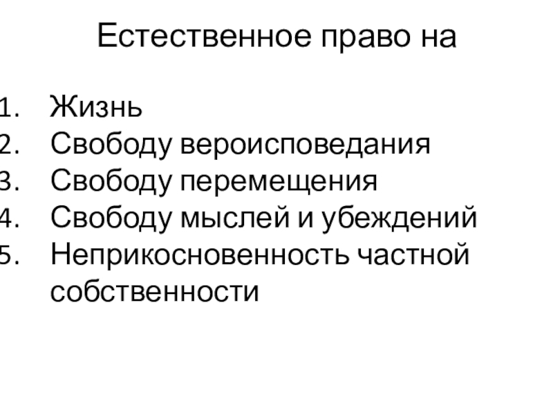 Естественное право наЖизньСвободу вероисповеданияСвободу перемещенияСвободу мыслей и убежденийНеприкосновенность частной собственности