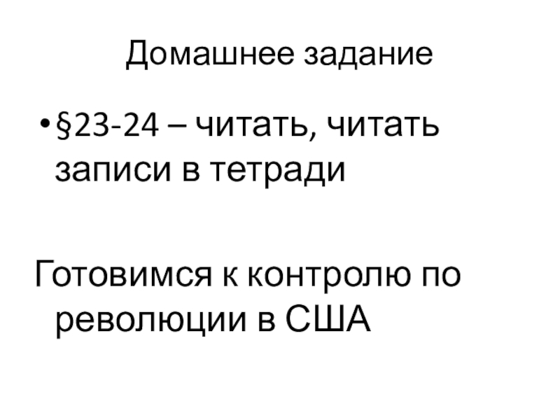Домашнее задание§23-24 – читать, читать записи в тетрадиГотовимся к контролю по революции в США